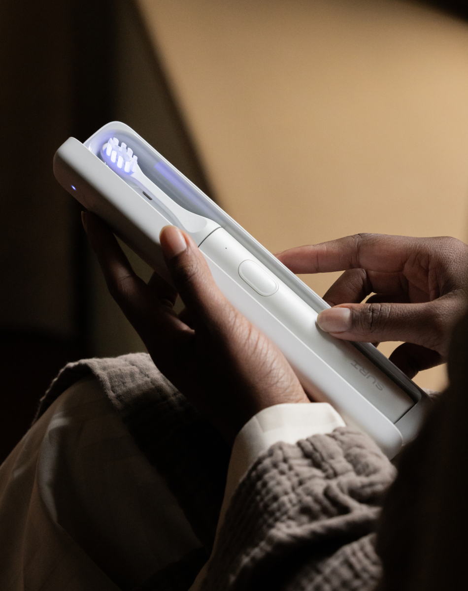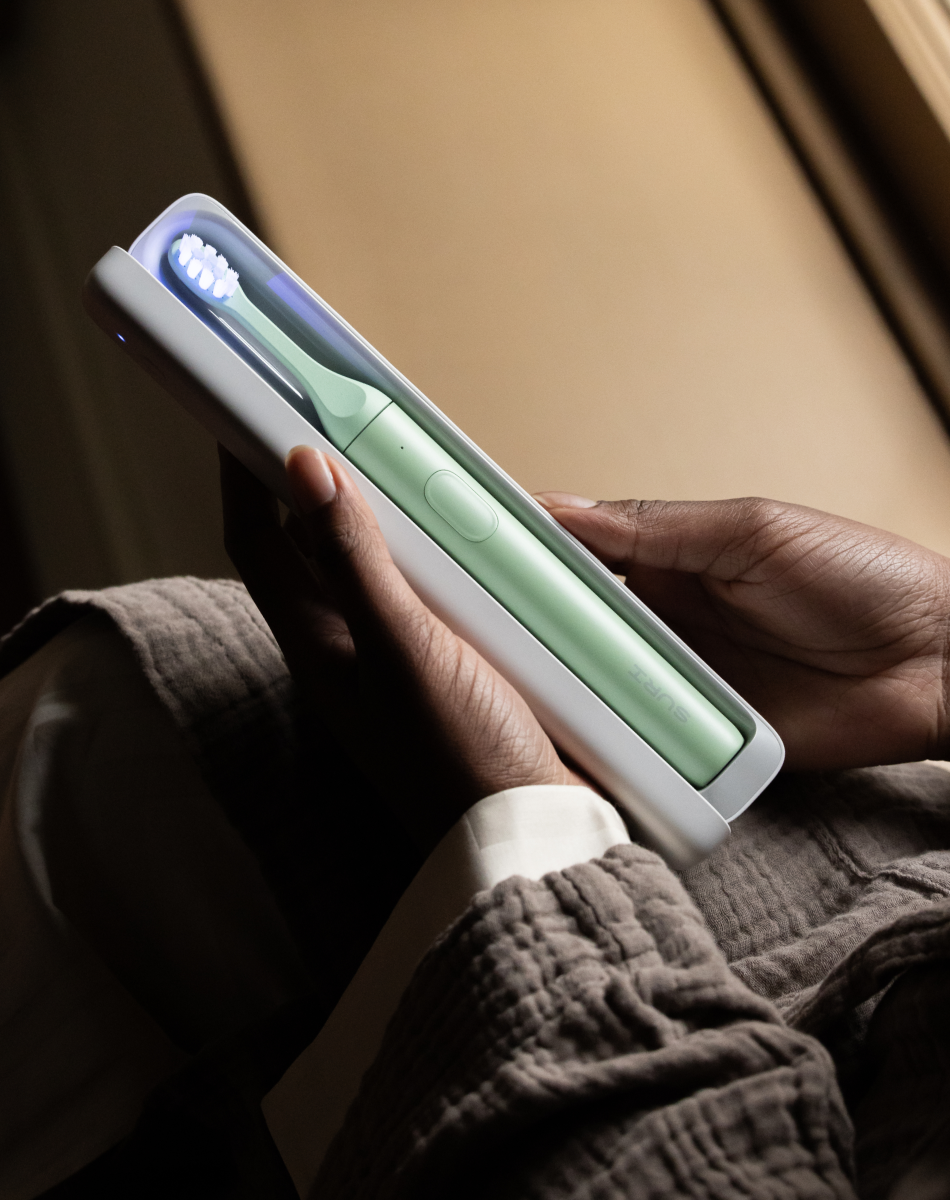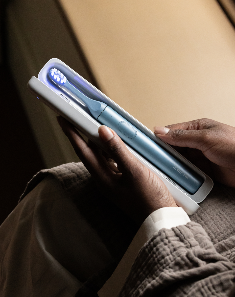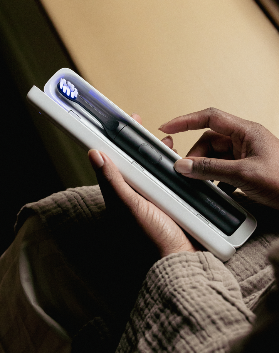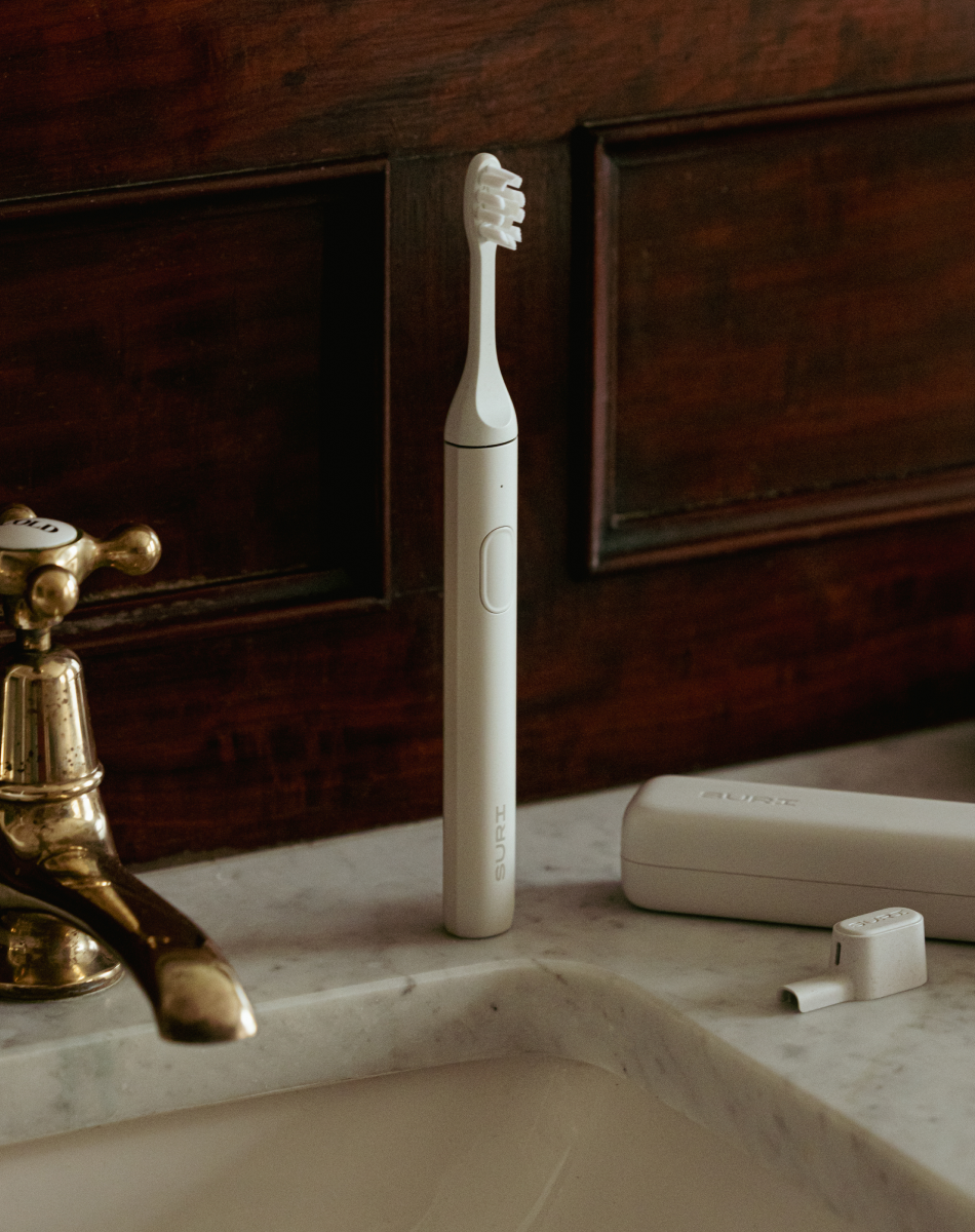 The award-winning SURI sonic toothbrush uses recyclable plant-based heads and bristles, and the slim aluminium body is more easily repairable. All while delivering a dentist-approved clean.