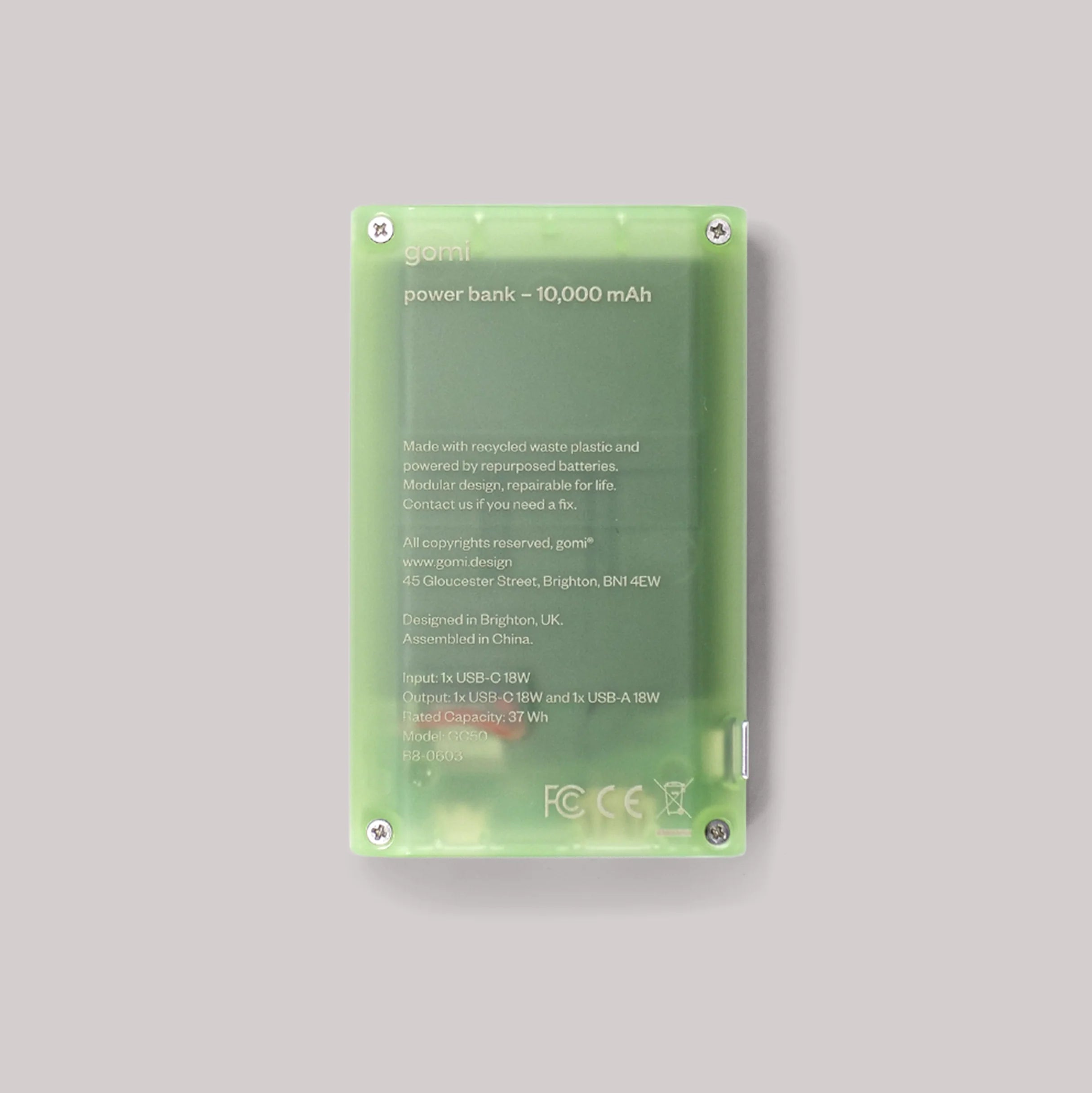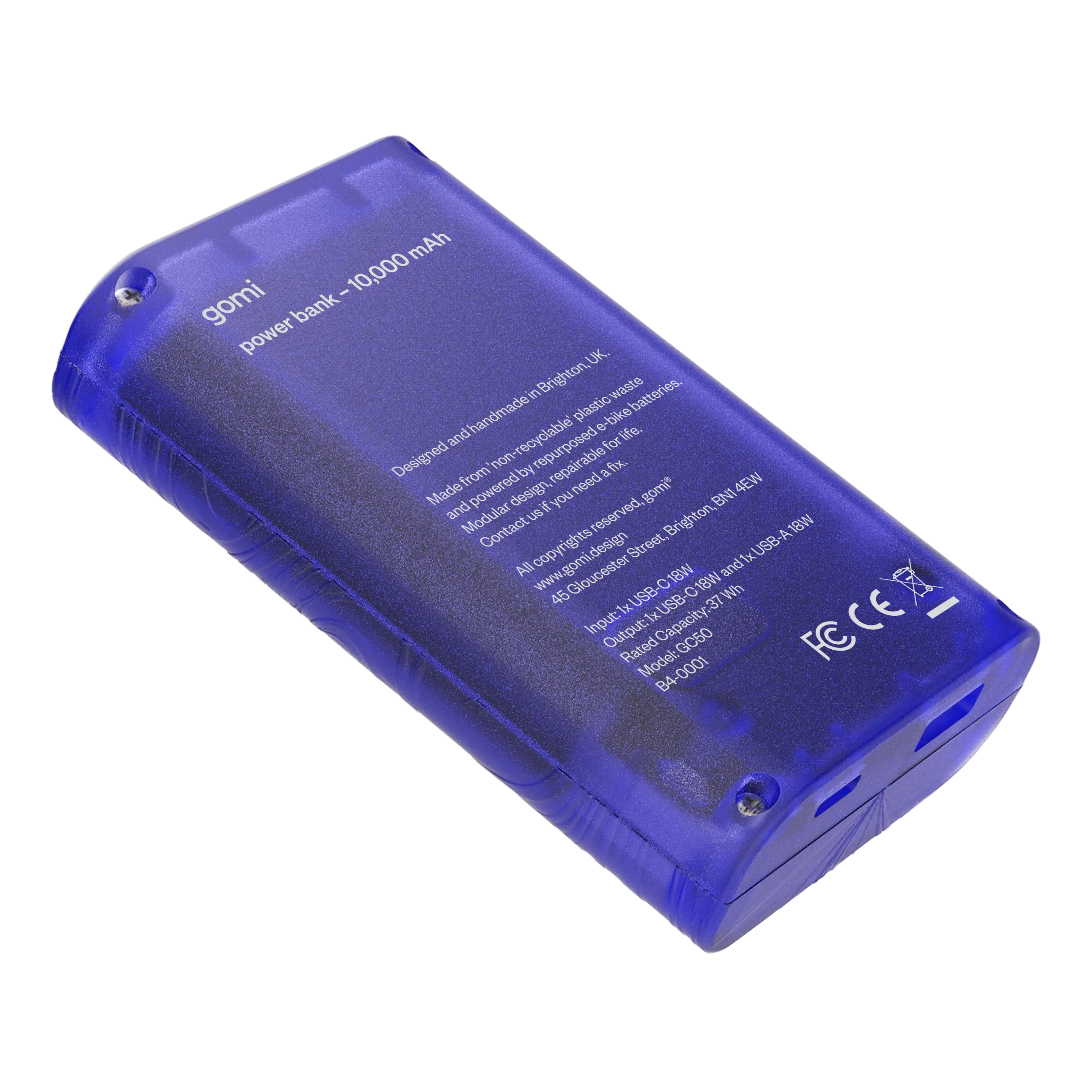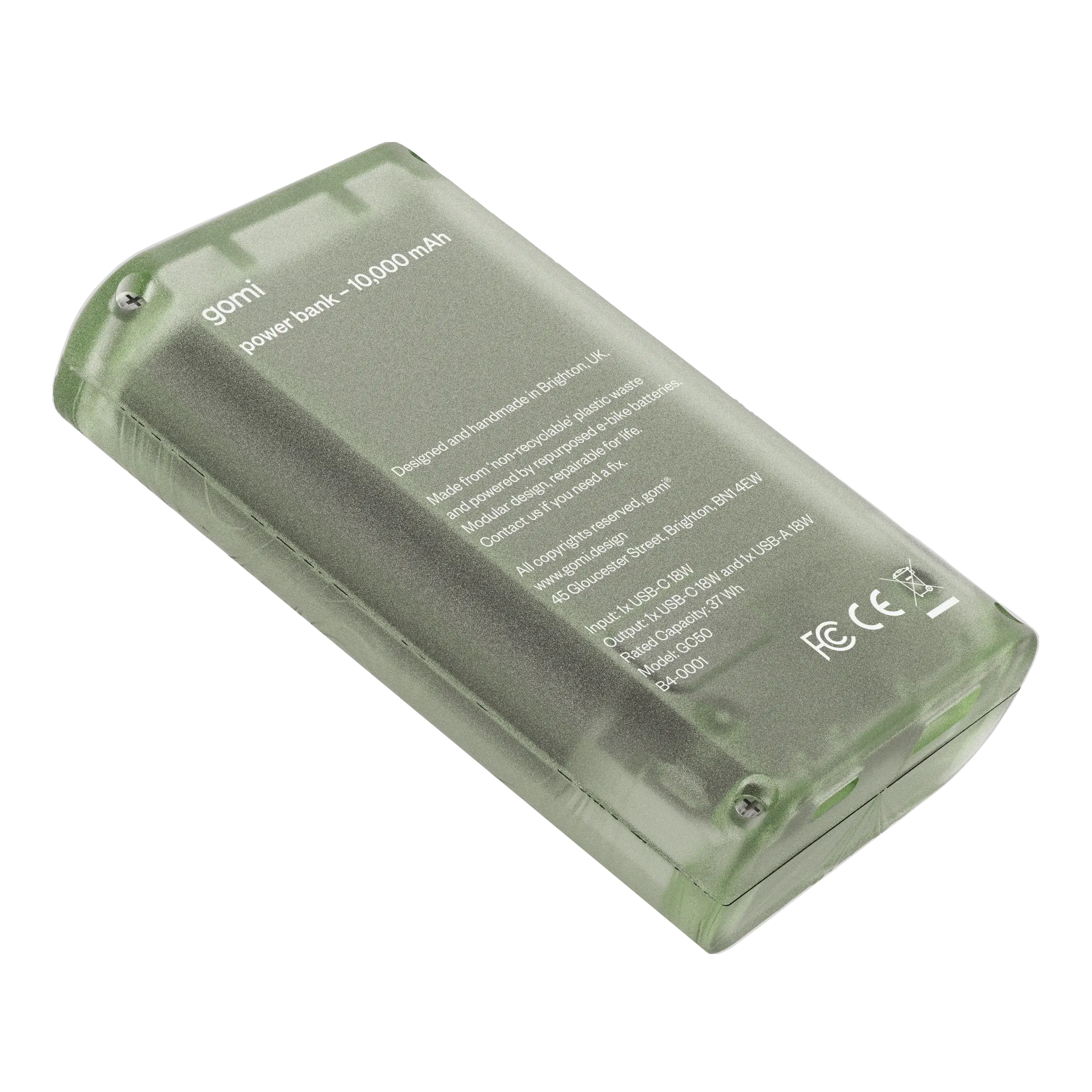Handmade in Brighton, the gomi Power Bank boasts lifelong repairs and holds enough power to re-charge your phone up to 3 times while you're out and about! Crafted from 100% waste plastic and second-life batteries, this 10,000mAh charger offers durable, eco-friendly power with USB-A and USB-C fast charging ports.