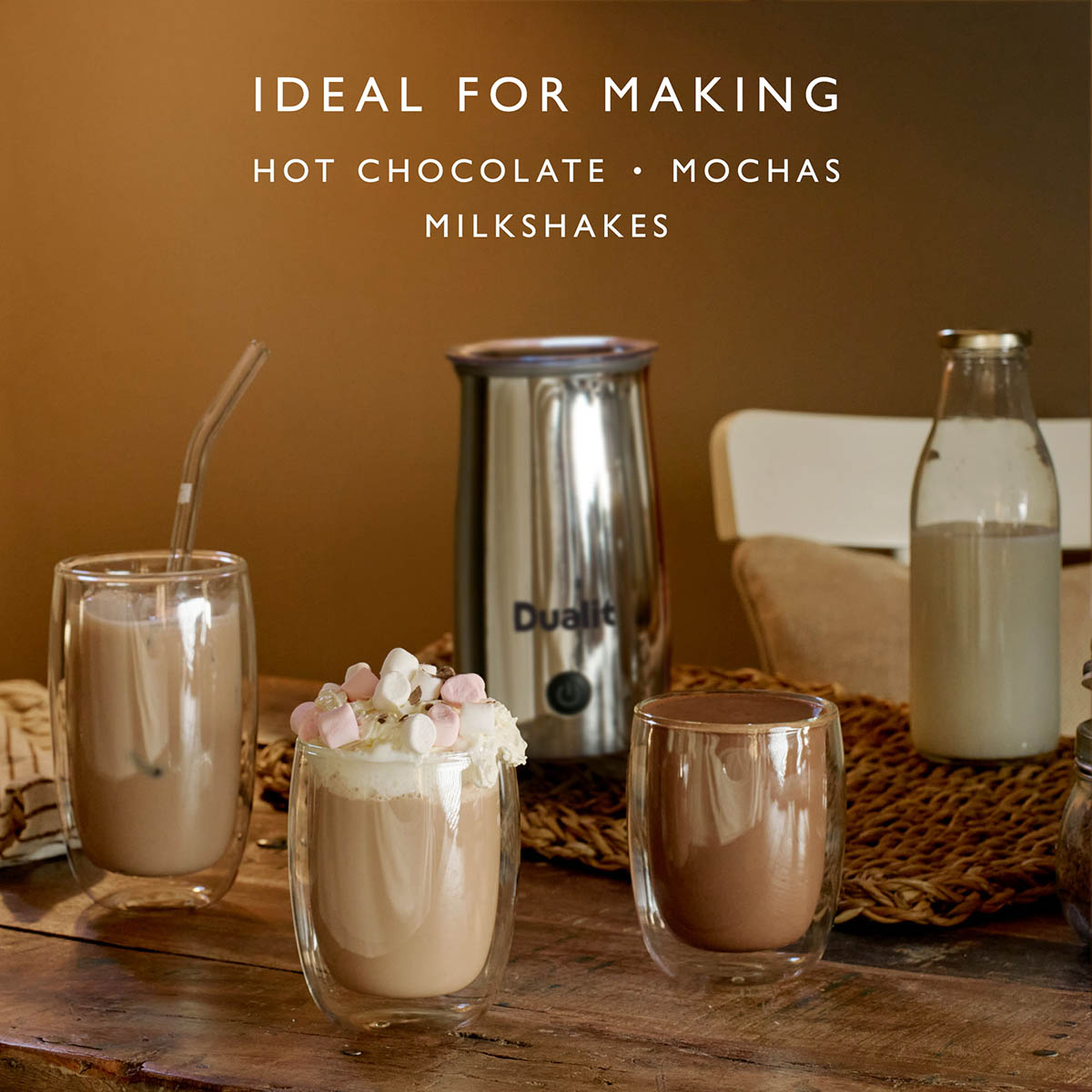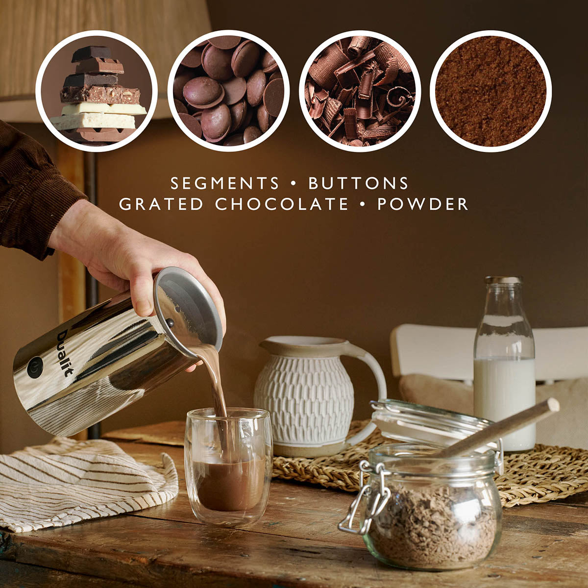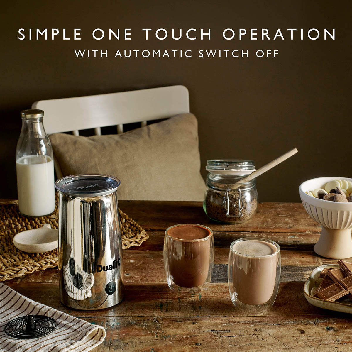 Selected for its exceptional quality, the Dualit Cocoatizer in Chrome delivers perfectly frothed hot chocolate at the touch of a button. Its premium construction ensures long-lasting performance and effortless beverage preparation.