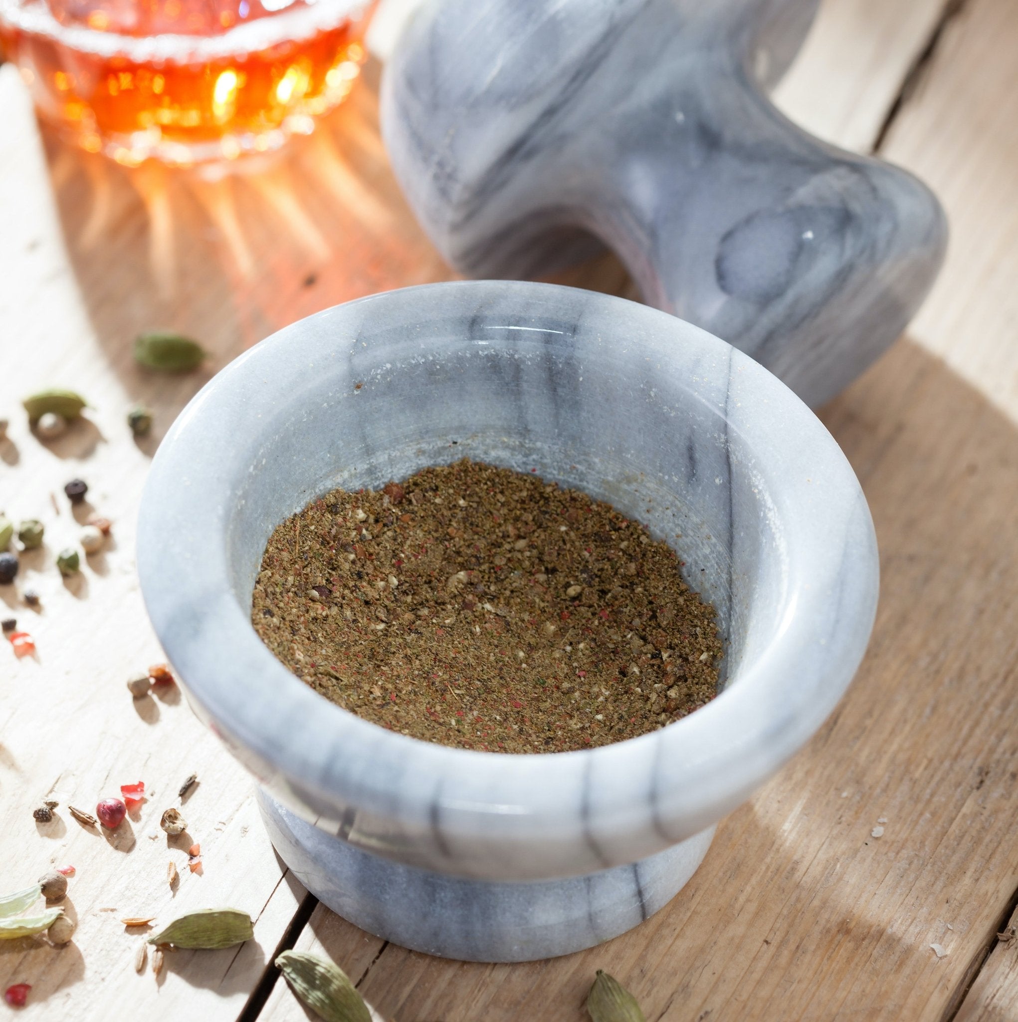 Grind up a spice mix in seconds with this solid, ergonomic spice grinder. The weight of the natural marble and wide-handled pestle makes crushing spices a doddle.