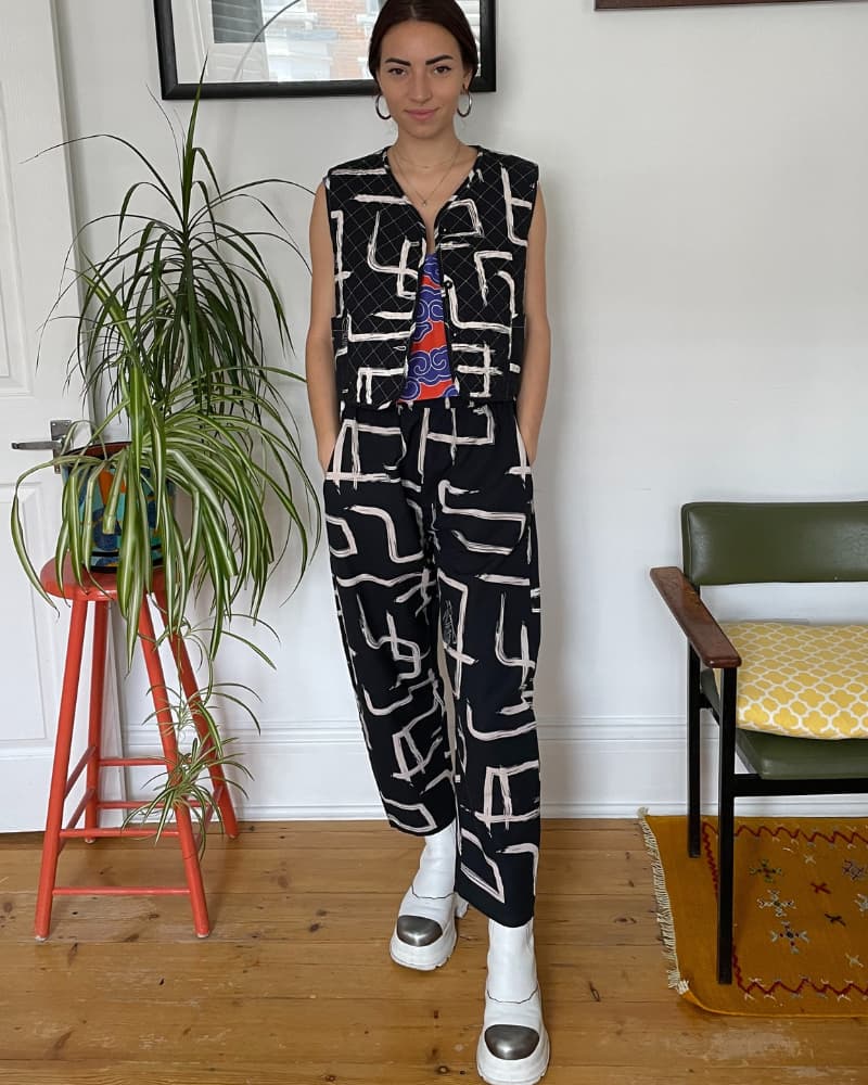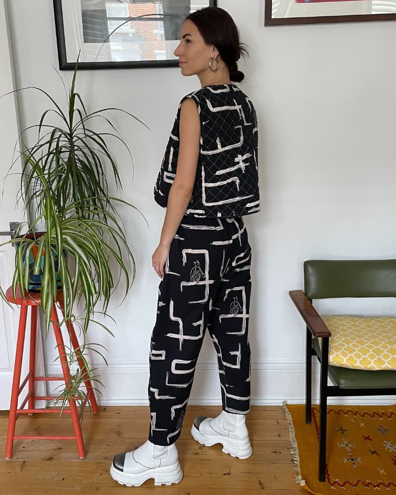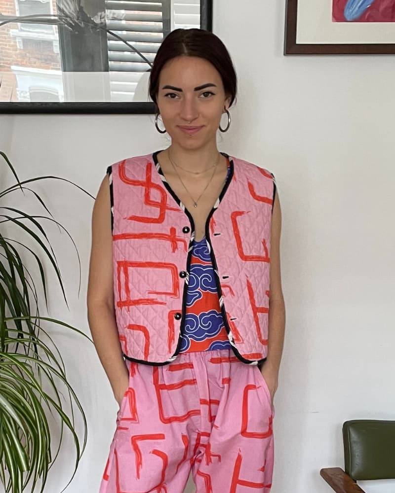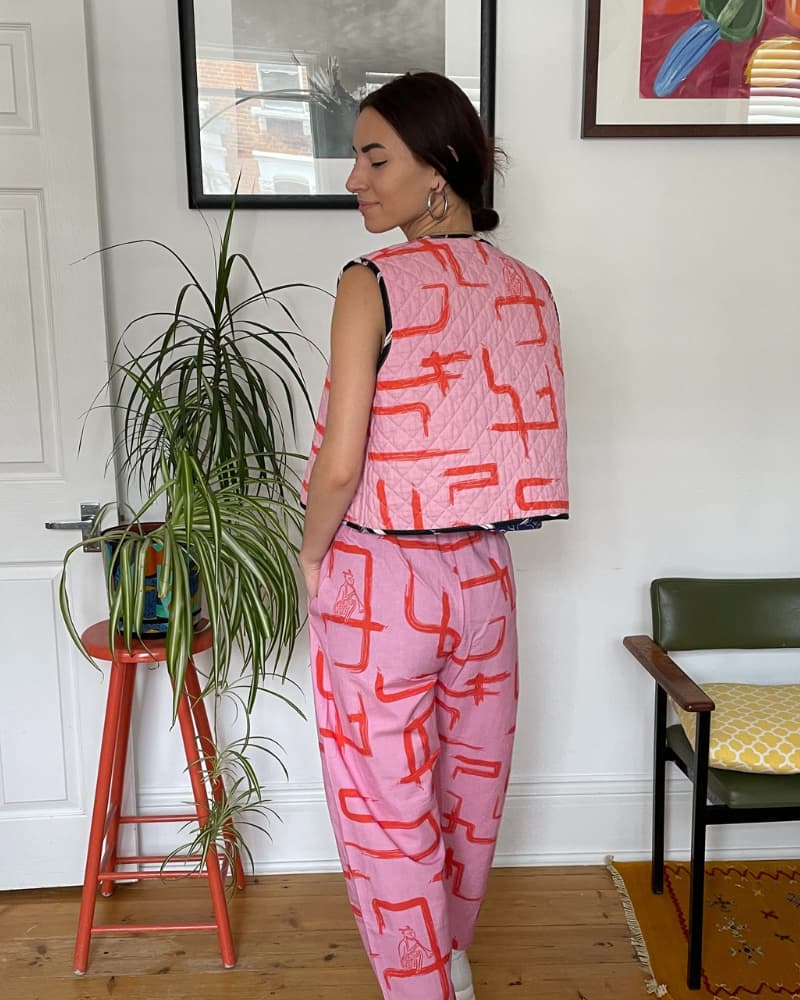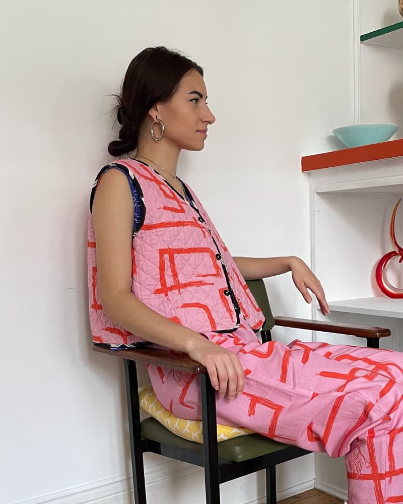 This Organic Cotton & Linen Reversible Quilted Vest with pockets is perfect for when you can't make up your mind. With one side featuring a playful pink and red pattern and the other an understated black and white, it's like having two outfits in one. The quilting is made from organic cotton for added cosiness. It'll keep you toasty and looking snazzy, whether you're layering it over jackets, jumpers, or dresses - there's no end to the combos!
